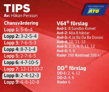 8 Sundbo Komet är väldigt bra och visade senast att formen verkligen är på topp då han vann i tuffare sällskap än vad han ställs emot nu. Trots att hästen står med dryga tillägg ska det vara toppchans.