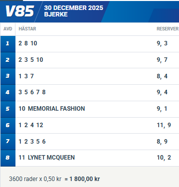 11 LYNET MCQUEEN (V85-8) Har riktigt fin kapacitet för den klassen hon befinner sig i. Trots småknivigt utgångsläge ska det vara utmärkt chans att runda samtliga.