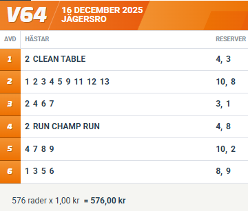 2 Clean Table hade inför senast inte startat sedan augusti i fjol. Trots att Maharajah-sonen lär ha varit väl förberedd i regidebuten räknar vi med att formen är framflyttat ytterligare och i ett litet startfält bör chansen på ledningen vara god. Väl i spets är det hästen att slå.