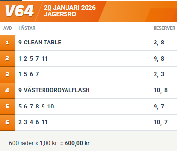 9 VästerboRoyalFlash har höjt sig markant sedan han kom till Christoffer Eriksson. På fem starter har det blivit tre segrar för femåringen som sett till insatserna vid segrarna, befinner sig i en för låg klass. Viktor Brodin håller bra nivå i detta amatörlopp och sitter bakom bästa hästen. Bra chans.