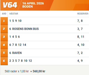 6 RAVEN (V64-5) lättas rejält till barfota runt om nu och gjorde ett klart vettigt lopp senast. Ska vara vassare nu och med skorycket och som spetsfavorit är det hästen att slå för övriga men kan vinna även med annan resa.