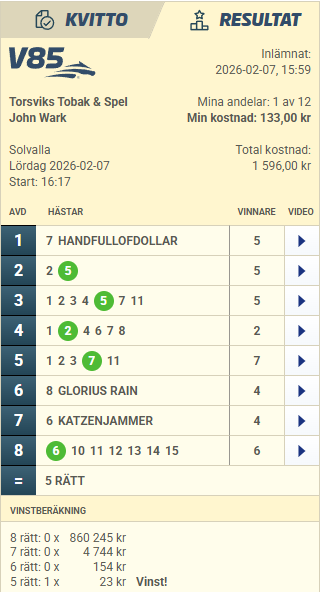 Mago Launcher kan vara hästen som sitter lite på nyckeln i detta lopp. Han är startsnabb och har bara förlorat från ledningen en gång på nio försök. Olle Alsén låter sugen på att testa i tätpositionen. Jag tror inte favoriten tar sig förbi och jag tror inte man släpper. Med 8 segrar på 9 försök i ledning borde taktiken vara given, även om det såklart är tuffare förutsättningar när det är V85.
