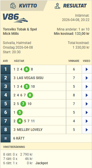 – 2 Tacky Sugar (V86-8) gjorde en jäkligt bra debut i Sverige senast. Hon bör ha gått framåt lite. Det är en mysig häst. Inga ändringar.