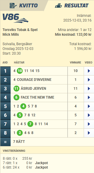 – 11 Viking Lane (V86-1) tror jag mest på. Han startade senast på V85®® och hamnade illa till och kunde inte ta så mycket där han satt och insatsen var fullt godkänd även om placeringen inte säger så mycket.