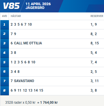 Det är viktigt att vara med i matchen om världsmästartiteln redan från start. Tävlingar pågår under fem veckor och i år räknas alla omgångarna, ingen lördag får alltså räknas bort. Sedan tycker jag att det är kul att spekulera i hur många rätt som krävs för att vinna VM i V85 2026. Ingen kommer såklart att fixa 40 rätt (väl…), men räcker till exempel drygt 30 vinnare, vi får se. Spännande blir det hursomhelst!