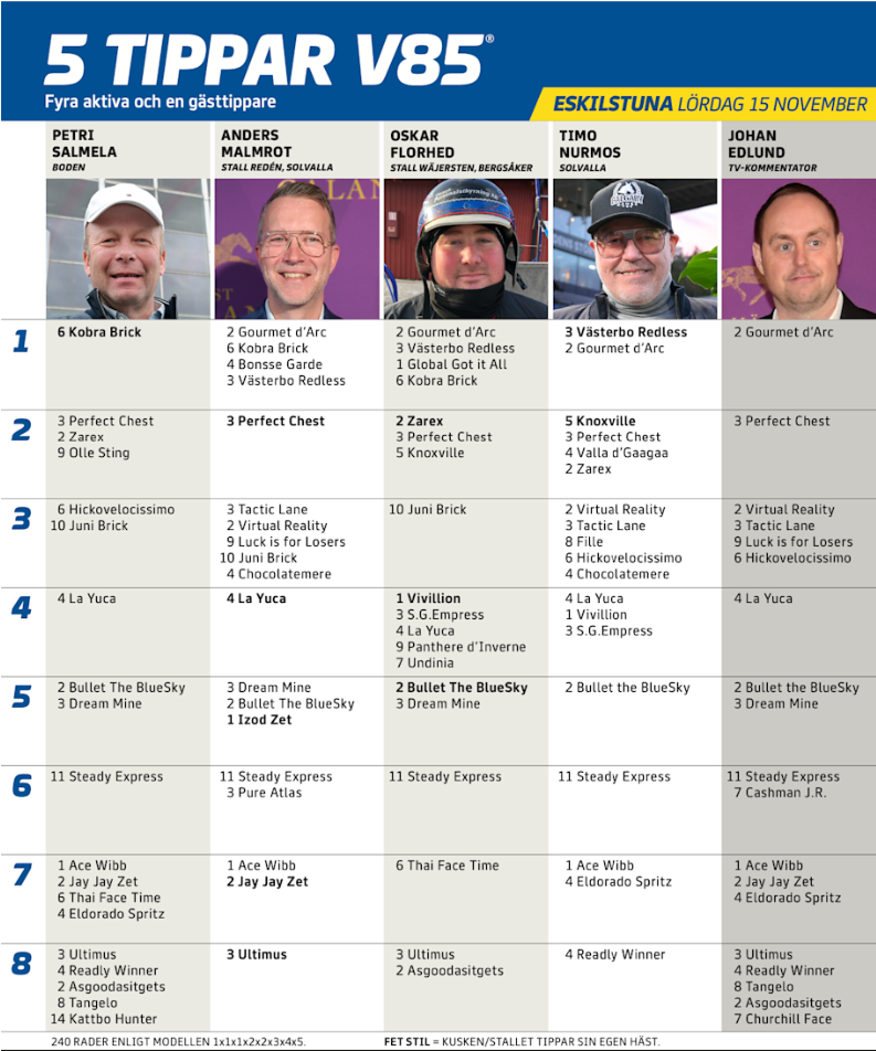 - Soulmate Pellini (V86-8) är en jättefin häst, stark och rejäl. Han vann med mycket krafter kvar i första starten för oss senast utan att det stämde 100 procent i aktionen. Han sprang och stegade och gick lite på fel hela loppet. Vi kommer köra med bakskor den här gången för att få travet att stämma bättre. Det jag är lite rädd för är att det är 1 600 meter. Starka hästar brukar gå bra på kort distans men jag tror att det kan vara i kortaste laget för honom och hade hellre sett att det var ett varv till. Den här hästen kommer vinna på V85 men jag är osäker på om han gör det redan nu. Vi ska testa rycktussar hemma innan lördag och funkar det kör vi med det. Blir det överpace tror jag på honom men går det 1.15 på varvet blir det svårt för jag har svårt att tro att han går 1.08 sista 500 bakifrån.