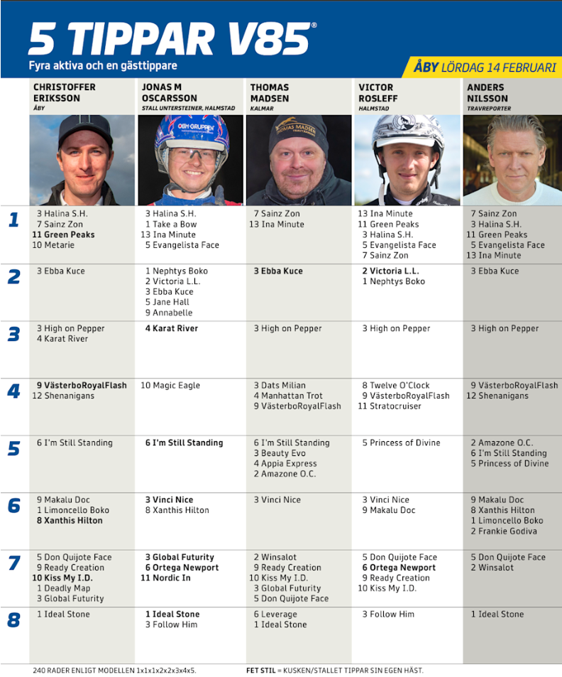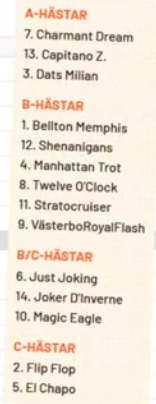 Kan aldrig tänka mig att Calle Jepson bakom 7 Sainz Zon bommar spets här, och självklart kör där. Den modige spikar. 3 Halina S.H. är även den startsnabb och kan få hålet, vilket innebär open stretch till slut. 8 Abbagliante känns hetast på tillägget.