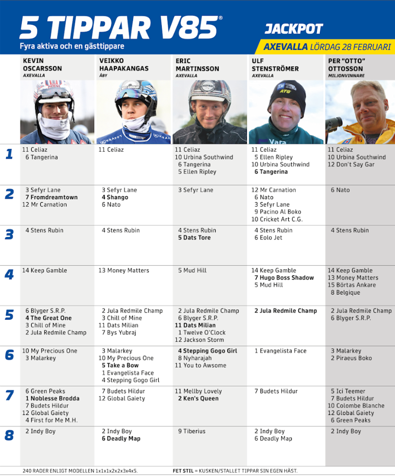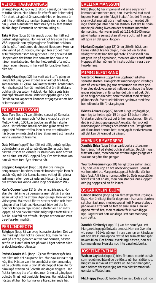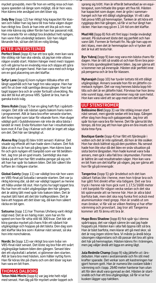 4 STENS RUBIN (V85-3) Blir väldigt hårt betrodd, med all rätt. Ska ses med utmärkt chans att nå spets och väl i den positionen förlorar han normalt inte om han bara är frisk och kry.