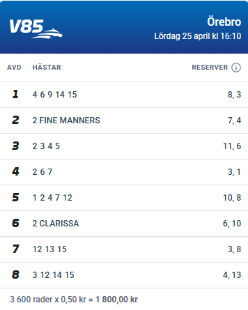 Klart att vi alla är nyfikna på vad Robban Bergh kan få ut av 2 Get A Wish som kommer hem efter äventyret i USA. Skicklig som Robban Bergh är tror jag på en bra prestation. 6 Bicc’s Tobee och 7 Kentucky River heter motståndarna men jag litar på Robban.