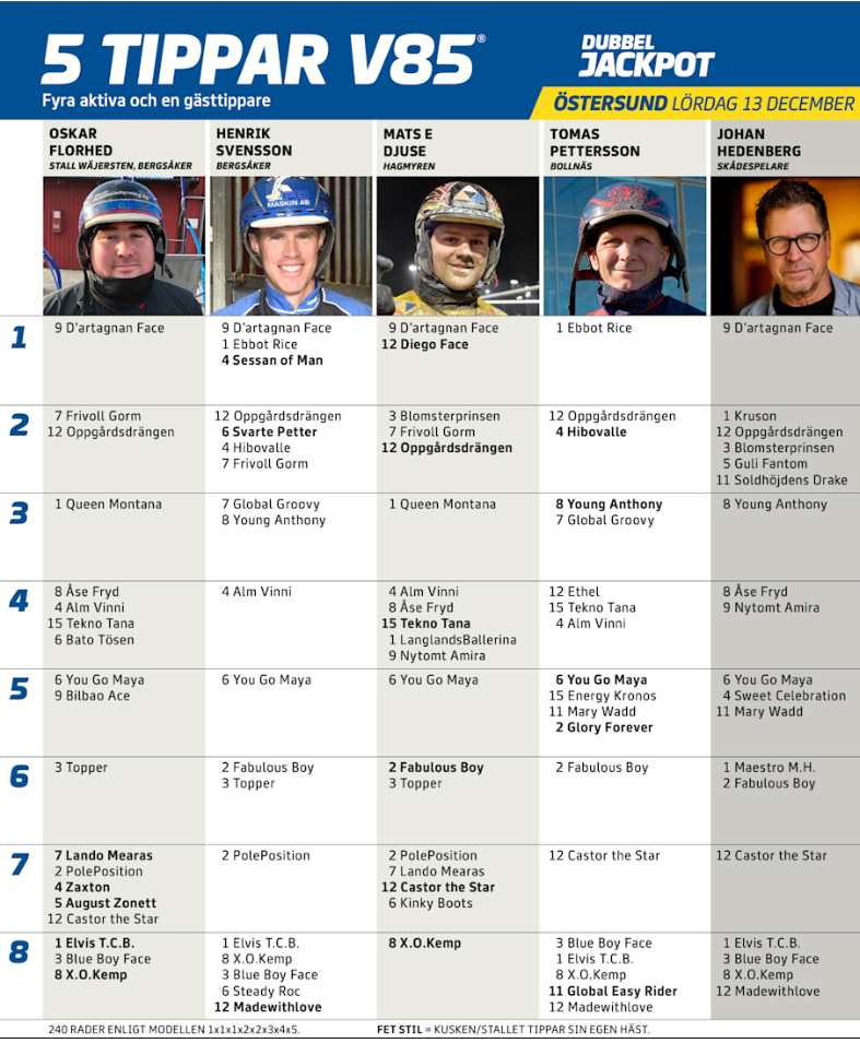 9 D’artagnan Face blir klar favorit då han kommit ut som en ny häst i regi Redén, vilket för övrigt nästan alla gör hos Sveriges skickligaste tränare. Detta är omgångens bästa spik.