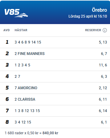… Det går vägen ändå och hästen jag syftar på är 7 Amorcino som kommer från stall Maria Törnqvist. Amorcino bara vinner, tror jag. 4 Olle Fri rankas högt i denna spalt, startsnabb som han är. 1 Don Gaagaa ska gå barfota, men det blir svårt att nå spets från innerspåret.