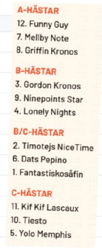 - Griffin Kronos har däremot ett tråkigt läge. Han blir kanske favorit men loppet i Boden senast var i billigaste laget. Det gick i 30-fart när han fick gratisledning varvet kvar och den som var tvåa i mål hoppade säkert bort 60 meter från start. Han var en annan häst med helstängt huvudlag och jag tar inget ifrån honom något för den segern, men det såg nog lite bättre ut än vad det var.