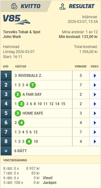 – 1 Dats Tore (V85-3) hade gott om krafter kvar senast, så det var synd att han inte fick chansen. Men ja, femma i Gulddivisionen är inte så dåligt det heller, vi fick en bra position men det handlar om att det ska lösa sig med. Stens Rubin var kanske inte på topp den dagen heller och sådant där är alltid svårt att ta med i ekvationen. Så nu går vi ut igen den här lördagen, jag förstod att det inte skulle bli så många anmälda när A Fair Day skulle vara med. Vi fick ett bra spår och det naturliga är väl att vi siktar på rygg ledaren, sedan blir det inte så lätt att vinna men det finns såklart fina pengar att köra om ändå.