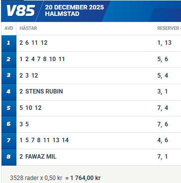 I år nöjer man sig med åtta hästar inklusive omgångens stora favorit 2 Stens Rubin (V85-4).