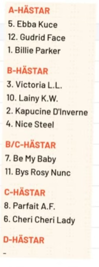 5 Ebba Kuce har varit struken inför den här starten, men ska träna bra. Fina förutsättningar och duger normalt utmärkt i aktuellt lopp.