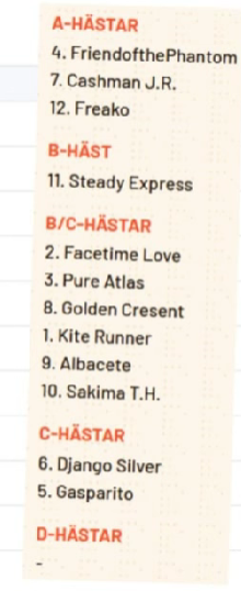 12 Freako visade även han senast att han har kapacitet som räcker för klassen och jag citerar tränare Svedberg i Travronden: "Han är jäkligt bra för klassen". Jag lägger till ett dock då han har fått spår tolv i Eskilstuna vilket inte är det lättaste. Han är stentuff och tål alla typer av upplägg när han har sin dag och kanske kan få rygg på favoriten denna gång och slippa göra grovjobbet, vilket han i och för sig tål.