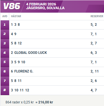 - Vad gäller Jägersroloppen så tycker jag 1 Björn Palema känns intressant i inledande V86-1 och 12 Outlander S.B. tror jag blir farlig om det löser sig minsta lilla från det dåliga spåret i V86-3. Stort lycka till med kvällens jackpot nu allihopa så hörs vi igen nästa vecka!