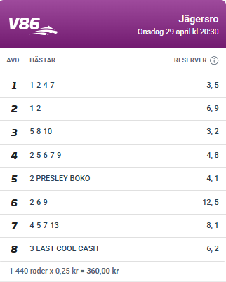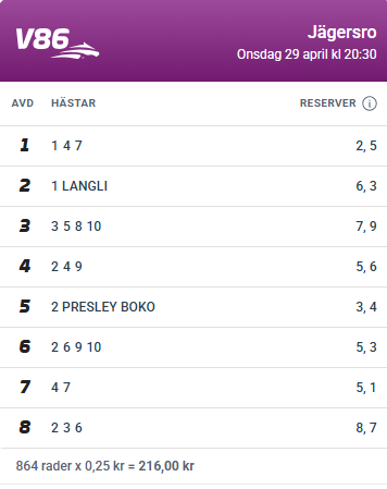 Utskriftsvänligt gratisprogram:V86 Xpress 29 april Solvalla/Jägersro