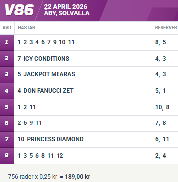 Andelsspel till kvällens V86. Mick Mills är öppnad. 12 andelar för 133 kr/st: