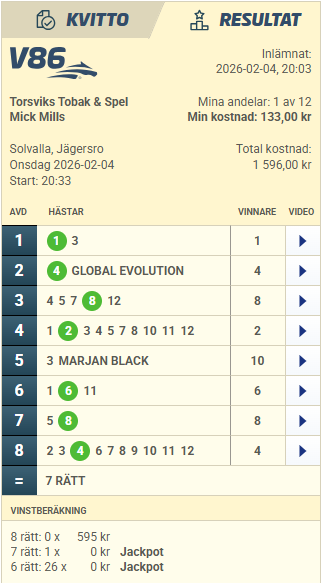 - Bästa spiken denna jackpotomgång tycker jag dyker upp i V86-2 där jag tror 4 Global Evolution tar hem detta. En segervan typ som jag tycker imponerar mer och mer och från ett bra utgångsläge så har man trumf på hand här och kan vinna detta på flera olika vis. Värsta motbudet har fått bakspår och jag räknar med att Magnus A Djuse lägger upp det på bästa vis och sätter dit ytterligare en etta för den här sexårige valacken. Spik för min del! Vid gardering så är det hästarna 1 och 9 i första hand och sen skulle jag fundera på främst 7,8 bakom ifall man letar riktiga rysare.