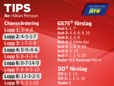 Hemmavid är det GS75 som gäller och det blir på ursprungliga banan Umåker efter några turer fram och tillbaka. Däremot flyttas starttiden fram till kl. 17:10 med tanke på Prix d’Amérique. Ett av affischnamnen är förstås S.G.Mistral som inte gjort sig känd som någon segermaskin men nu har två av två i Oscar Berglunds regi. Definitiva startlistor kommer först på onsdag. Omgången är Jackpotbetonad med 2,5 miljoner fördelat i de tre vinstpoolerna. Som vanligt är du garanterad 10 miljoner om du blir ensam med sju rätt.