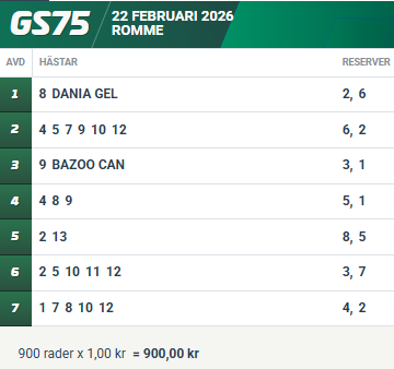 8 DANIA GEL (GS75-1) går från klarhet till klarhet och vann övertygande senast. Har ett fint springspår och bör hitta till spets eller dödens tidigt. Hon sticker ut rejält och har toppchans oavsett resa.