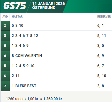 – Jag var nöjd med 2 Dats Pepino (GS65-6/DD-1) senast, i alla fall som det blev Han fick tävla med brodd och fick lite för bra fäste och det blev lite fel helt enkelt. Nu har han inte gått sina snabbare intervaller innan som jag brukar köra, hästen känns fin och har ett bra läge. Jag laddar och kommer vi till ledningen kan jag tänka mig att köra där. Han är bra för den här typen av lopp och ska räknas tycker jag.