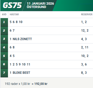 – 10 Majestät (GS75-7/DD-2) fick det inte att stämma riktigt senast. Jag är nöjd med hästen för dagen annars, men även med honom har det inte gått att trna som jag velat och varit optimalt. Detta är en bra häst som kanske inte fått visa det riktigt. Klaffar det hoppas jag att vi ska kunna vara med där framme.