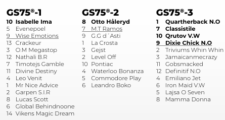 Söndagseftermiddagen tillbringar vi i Årjäng och i anmälningslistorna till GS75 hittar vi två segervana; norska kallblodet Hauk Viktor (lopp x) som har årsdebuten överstökad samt montéspecialisten M.T.Ramos (lopp x) som lyfter sig en klass utan dojor.