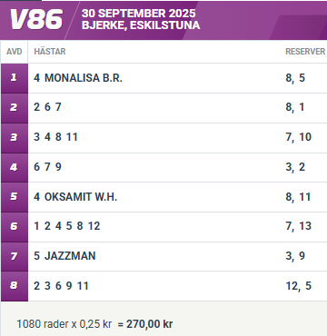 – 10 Kalle May (V86-7/V4-3/DD-1) gikk et bra løp sist og sto på helt inn, men det var vanskelig å nå helt fram i et oppgjør hvor de kjørte 1.11 i front. Han har trent fint etterpå, alt er som normalt. Bør kjempe blant de tre fremste. Utstyr og balanse blir som normalt, informerer Kim Pedersen.