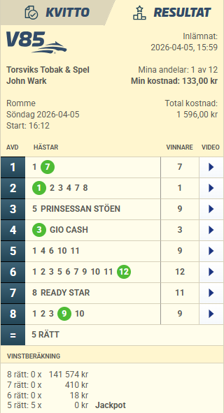 – 5 Express Jab (V85-8) har gjort två bra lopp i år och senast spurtade han vasst som trea i V85. Det är en fin häst som nu har fått två genomkörare i kroppen. Han är fortfarande orutinerad men kommer han till ledningen så tror jag att han tävlar bättre där än bakifrån. I så fall kan han nog leda länge och han är inte borta. Barfota bak igen och inga ändringar.