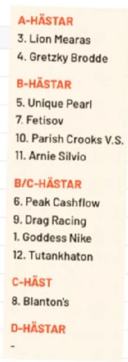 4 Guli Hektor är en liten personlig favorit hos mig bland kallbloden. Han är inte stor, men oerhört häftig och vann senast i stark stil och besegrade då 12 Blomsterprinsen relativt enkelt. Hästen har lyckats bra med Magnus A Djuse tidigare och hästen tål jobb på egen hand om så skulle krävas. Jag tycker att han står sig riktigt bra i det här loppet. 5 Åsvinn S.K. är en sagohäst för Knut Arne Ödegaard. Hästen avslutade bra senast i en snabb avslutning men gången innan visade han lite tveksam moral på upploppet. Han trivs i ledningen (7/7 på svensk mark), kan öppna bra och kan vara ledaren från start till mål. 12 Blomsterprinsen krigade på bra hela vägen in i mål senast men kunde inte utmana Guli Hektor. Svårt placerad men det är en spårtrappa och han har tjänat mest pengar i loppet. Tuff uppgift men hästen är bra och kan köras på flera olika sätt.
