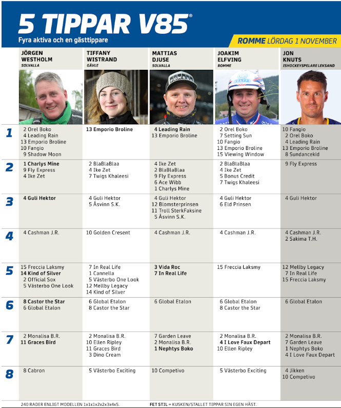 Kunde aldrig drömma om att ATG samt de ansvariga redan så här tidigt av V85 vågade lägga ut en så fullständigt fantastisk omgång som denna. Med två lopp á femton hästar, samt näst intill fulla fält i de övriga loppen. Världsklass!
