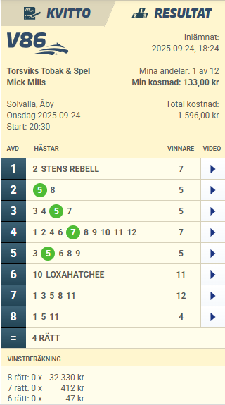 Andelsspel till kvällens V86. Mick Mills är öppnad. 12 andelar för 133 kr/st: