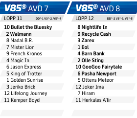 10 Bullet the Bluesky höll tappert bakom Dream Mine senast. Galopperade som klar favorit i Derbyt men har förutom det i stort sett haft en prickfri karriär. Vann Breeders Crown som treåring och har chans att göra det igen som fyraåring. Han kommer tävla optimalt utrustad, precis som han gjort på sistone. 2 Walmann fungerade fint barfota runt om senast och såg frän ut då han trots ett tufft lopp vann på ett respektingivande sätt. Mycket bättre startspår kontra värsta konkurrenten och skulle Claes Sjöström kunna köra sig till ledningen växer chanserna men hästen är ingen katapult bakom startbilen. 9 French Kronos är lite till och från i stilen och har nära till passgång. Fungerade fint och avslutade bra i skymundan senast. 4 Magic In vann knappt senast och imponerade inte. Han hamnar högt upp i rankingen för att man ska göra lite ändringar på utrustningen nu och att han har väldigt hög kapacitet, men han måste vara "100 meter" bättre än senast. 8 Nadal B.R. var klar favorit i det norska Derbyt, men hade ingen superdag då. Klart bra avslutning senast och det är en fin häst men förutsättningarna är tuffa och mina två A-hästar är troligen lite för bra men ska du gardera brett ska hästen med.