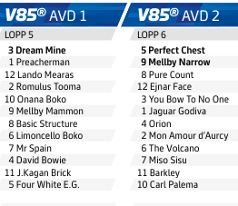 3 Dream Mine har haft ett sagolikt år - där han på åtta starter tjänat 7,4 miljoner kronor och tagit sex segrar. Senast ledde han varje meter av Europaderbyt och såg magnifikt fin ut och vann oerhört enkelt. Mats E Djuse är på kusk-VM så tränare Jörgen Westholm kör honom nu och han vann E3 med hästen ifjol. Det mesta talar för tidig ledning och sedan seger. Vi inleder omgången med bästa förslaget till V85-spik, han blir oerhört svårslagen. 1 Preacherman har perfekta förutsättningar och når troligen rygg på storfavoriten. Är Dream Mine sämre kan han utmana, men mest troligt är det bra chans på en finalbiljett av Breeders Crown. 12 Lando Mearas har sett grym ut på sistone, men spåret ställer till det. Hästen är i bra slag, gick fint i skymundan senast och har varit riktigt fin vid segrarna - framförallt i Umeå då han glänste modell större.